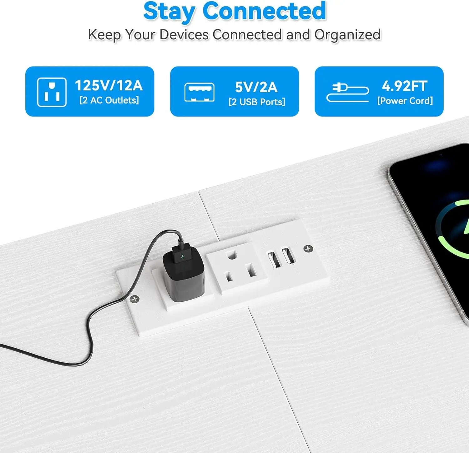 - LED lighting and built-in outlets keep cords tucked away and devices charged, so you can tailor ambiance while you watch.