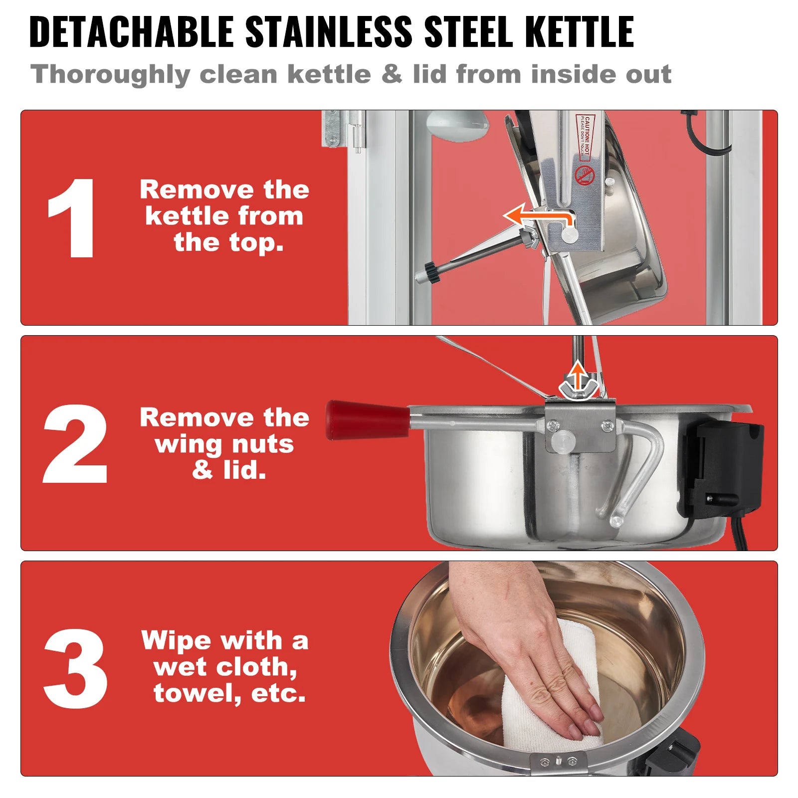 - With three independent switches, you can control the kettle, the warming tray (50W), and the warming light (60W) to keep popcorn warm for service.