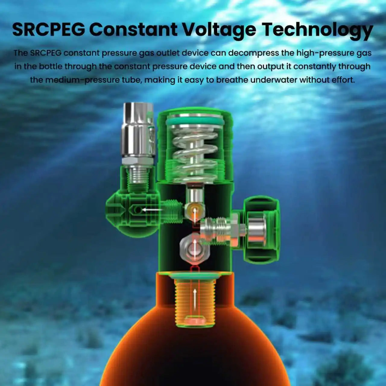 - Constant-pressure breathing: SRCPEG device decompresses high-pressure gas to a steady medium-pressure output; a 360° rotatable joint with a rugged medium-pressure tube lets you move freely in any underwater posture.
